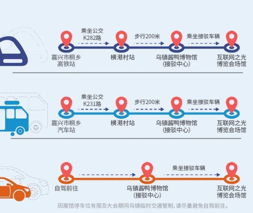 因大会期间乌镇临时交通管制,且博览会停车场停车位有限,请观众尽量不要自驾前往。若确需自驾前往乌镇,可将车辆停放在乌镇酱鸭博物馆停车场,在此免费换乘接驳车直达博览会场馆(路程约15分钟)。