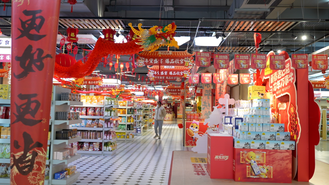 与此同时,线下商场也是天天不打烊。“龙元素”装点商场,丰富多彩的“龙味”年货商品被摆在最显眼的位置。除了可以“买买买”之外,商场内好逛好玩的展陈布置,也吸引了不少市民游客前来打卡。