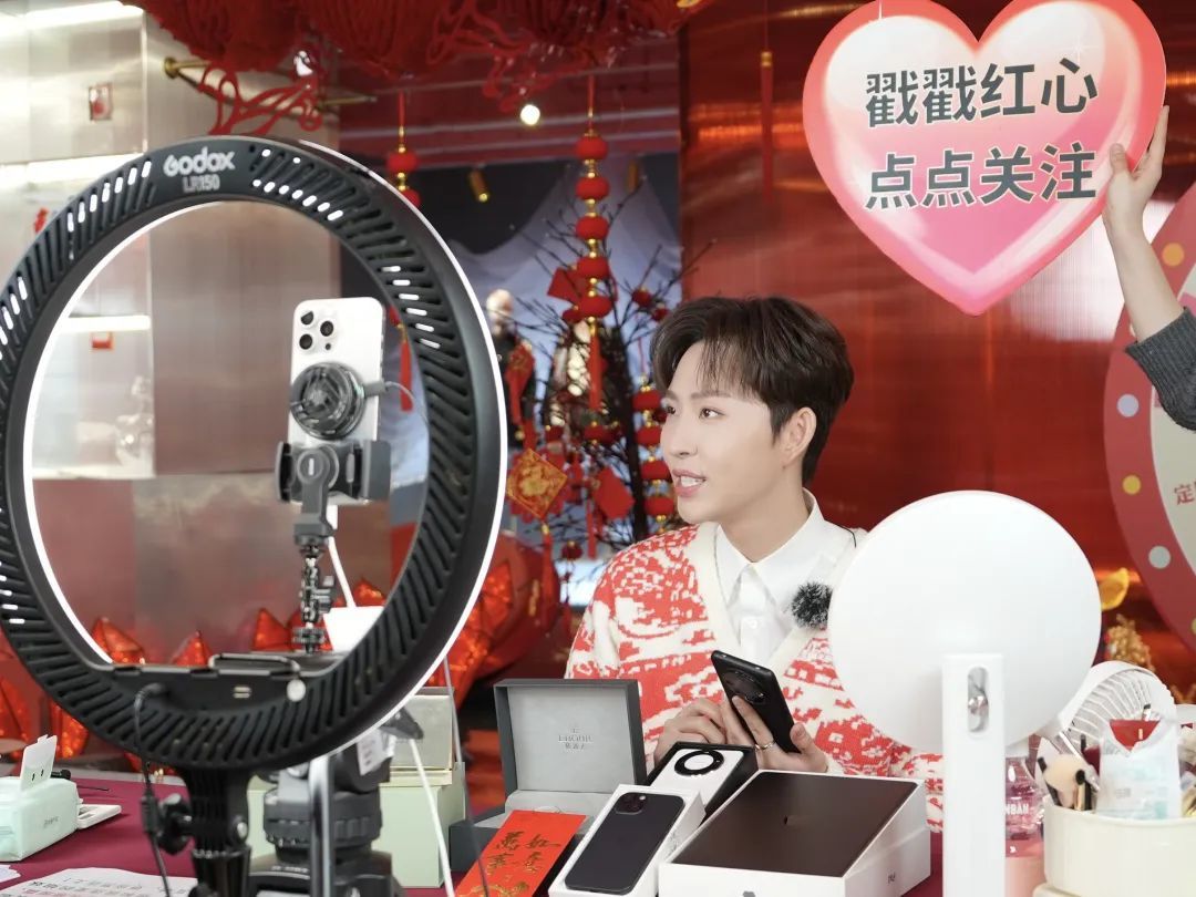 商场内各处都可以看到正在直播的主播。在“2024年货年装节”的巨幅LED屏前,主播雪宝不断“变装”登场,为大家推荐新年新服饰。从初一到初七,她每天都会进行直播带货。一楼的美妆空间内,主播团队也在不间断地“上链接”。记者了解到,在春节期间,遥望科技旗下百余名主播都可能在线上开播。
