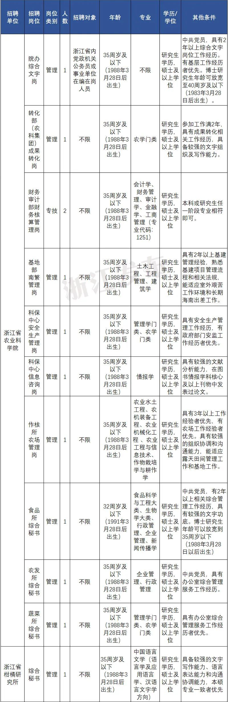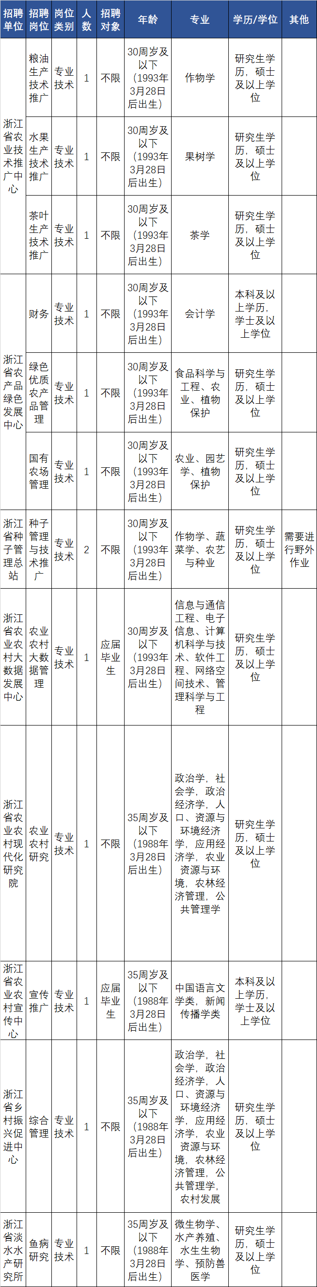 此次招聘的省农业农村厅所属事业单位共8家:浙江省农业技术推广中心、省农产品绿色发展中心、省种子管理总站、省农业农村大数据发展中心、省农业农村现代化研究院、省农业农村宣传中心、省乡村振兴促进中心、省淡水水产研究所。