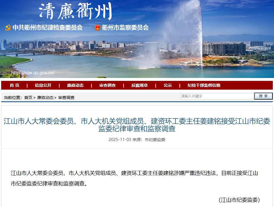 据浙江省江山市纪委监委消息:江山市人大常委会委员、市人大机关党组成员、建资环工委主任姜建铭涉嫌严重违纪违法,目前正接受江山市纪委监委纪律审查和监察调查。