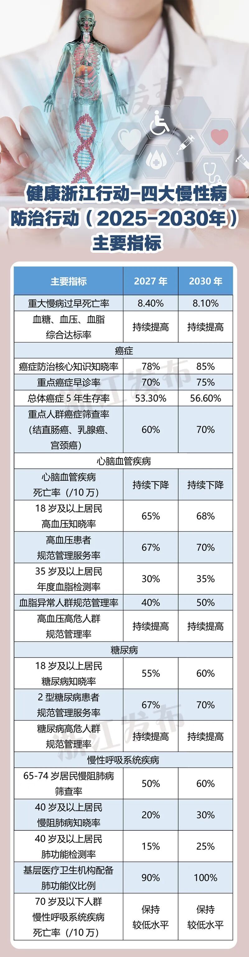 近日,浙江省卫生健康委、省爱卫办(健康办)印发《健康浙江行动—癌症、心脑血管疾病、糖尿病和慢性呼吸系统疾病防治行动实施方案(2025-2030年)》,明确将打造全过程、全周期、智能化的慢性病防治服务高地。