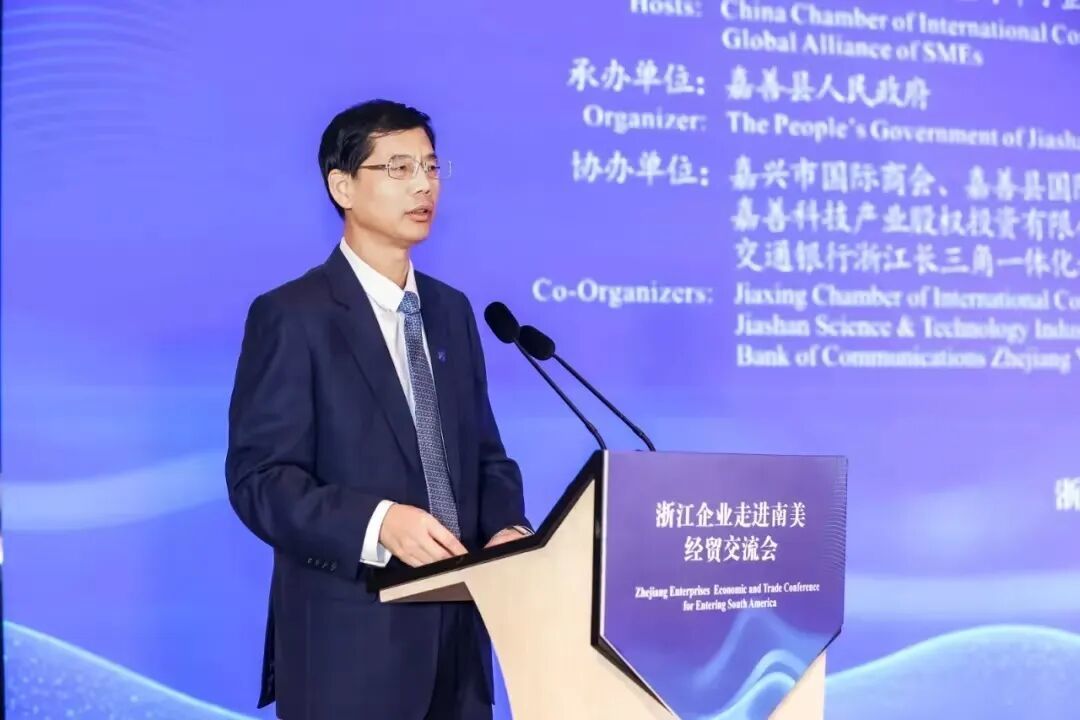 为深化南南合作,助力浙江企业开拓南美新兴市场,11月16日,“浙里出海”浙江企业走进南美经贸交流会在嘉善成功举办。浙江省贸促会、省国际商会会长陈建忠,嘉善县常务副县长楼向辉,全球中小企业联盟执行主席兼秘书长曹方出席会议并致辞。联合国工业发展组织第三任总干事、全球中小企业联盟主席卡洛斯·马格里诺斯,阿根廷中国商会海外事务委员会(大中华区)秘书长王志骏作主旨演讲。浙江省国际商会理事会成员单位、有意愿开拓南美市场的浙江企业代表等逾百人参会。