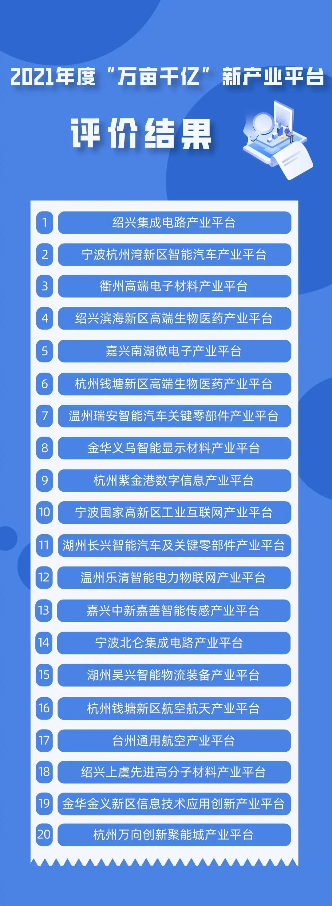 根据《浙江省“万亩千亿”新产业平台建设评价办法(试行)》和有关工作安排,省发展改革委组织开展了全省20个“万亩千亿”新产业平台建设2021年度评价工作。评价结果排名如下: