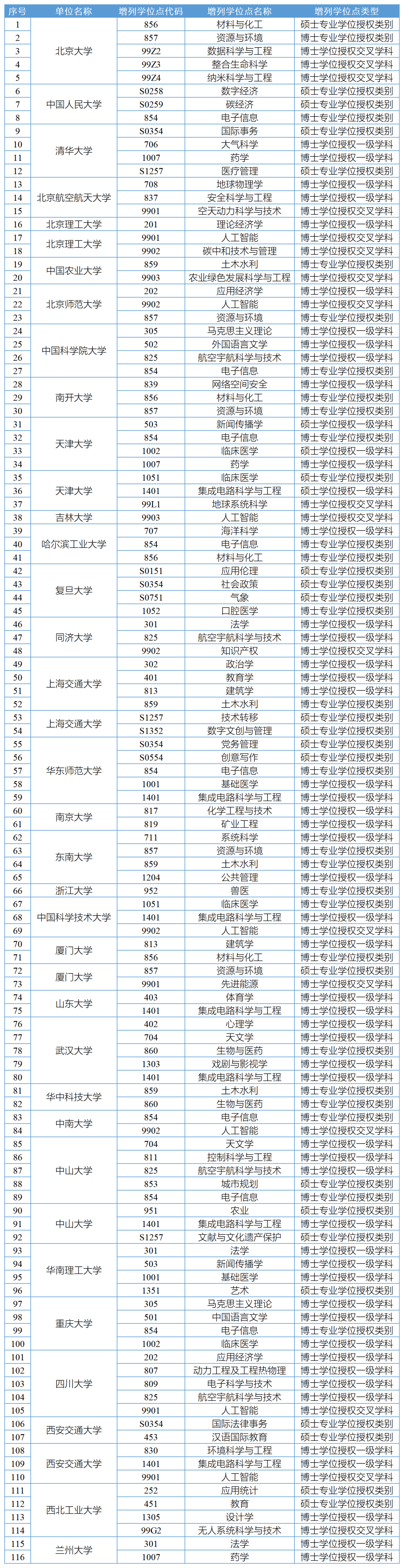 增列学位授权点116个