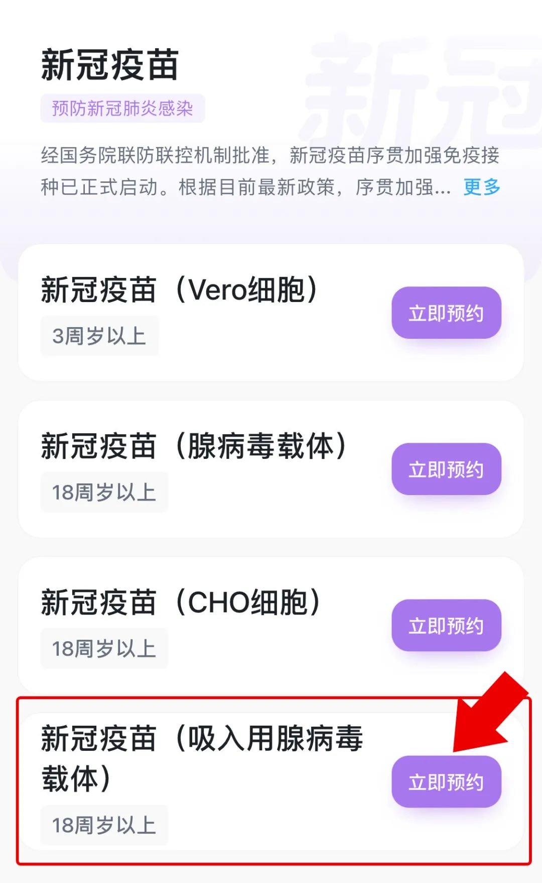 目前,这种“吸入式”——吸入用重组新冠病毒疫苗(5型腺病毒载体)加强免疫接种已在浙江正式启动。大家可登录“浙里办”APP,搜索“预防接种”,选择“新冠疫苗(腺病毒载体)”模块,即可找到“新冠疫苗(吸入用腺病毒载体)”预约选项。