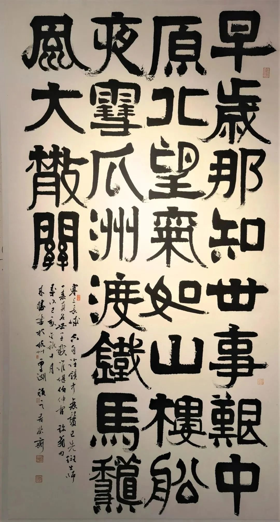 何来胜以隶书著称,从汉碑入手,又广泛借鉴清代中期以来隶书名家的技法及风格,其点画放折挺健,行笔畅顺而浑厚,结体端庄严整,时时化用篆书结构,因而平中见奇,壮中寓谐,迥异于时风。
