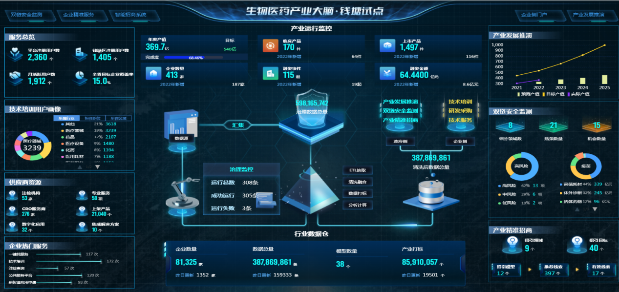 据了解,截至目前,“生物医药产业大脑”已汇聚300余万家医药企业数据,注册企业2300余家,月活跃用户近2000+次。