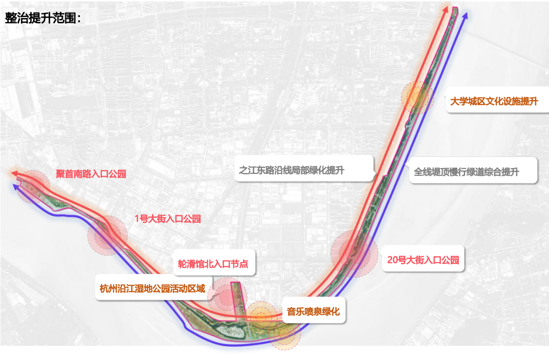 江滨主题公园改造提升工程西起聚首南路,东至银海街,整治路线全长16.5km。项目以江滨运动廊道为主线,以沿线生态老城区、活力亚运区、宜居新城区、跃动大城区四大板块为核心,重点对聚首南路入口公园、1号大街入口公园、轮滑馆北入口等6个点位进行绿道、绿化等多个方面的提升,提升绿化面积约 102416.2平方米。