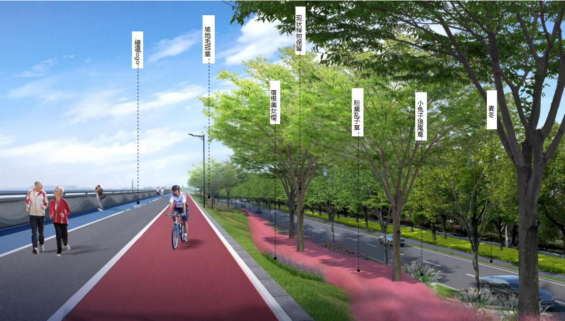 此外,项目还将根据生态性、特色性、持续性原则,对沿线绿植空间进行合理优化提升,大力保留现状大乔木作为背景空间,补植多年生宿根花卉,以橙黄色系为主,粉蓝色系为辅,对场地进行主题增色、形象添彩的提升工作。