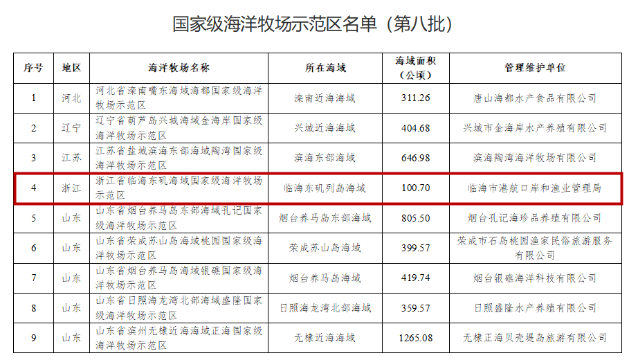 近日,农业农村部公布第八批国家级海洋牧场示范区名单,浙江省临海市东矶海域国家级海洋牧场示范区成功入选。