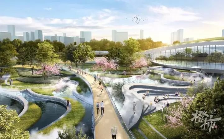 此外,由于利用公园内部的水系,这里还规划了水上巴士,你可以在滨水码头乘水上巴士游览,抬头仰望穿梭而过的高铁列车以及高耸入云的摩天大楼。