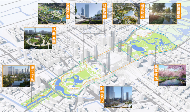 项目以杭州西站为核心,分为南北两区,西站以南的站南片区,将打造云门公园,以山水谷为疏朗通透的蓝绿核心,串联文化谷、乐潮谷、创智谷、演绎谷,打造生态绿色中轴线。
