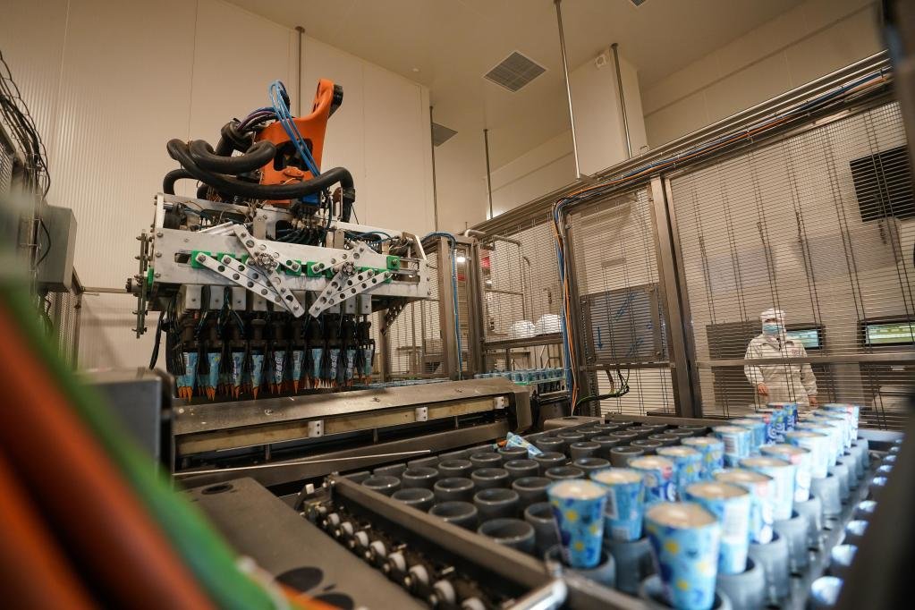 位于江苏苏州太仓的联合利华和路雪生产基地,于2021年9月获评全球“灯塔工厂”,成为当地“智能制造”的标杆。工厂里,机器人正将产品转移到速冻隧道。新华社记者 季春鹏 摄