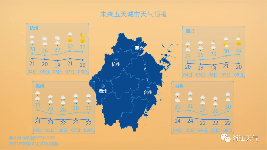 全省多云到阴有时有阵雨或雷雨,其中浙中南地区部分有短时暴雨。