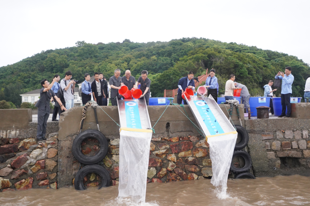 在检察官、法官、渔业科研人员、渔民代表等协助下,万余尾大黄鱼、黑鲷等海洋生物苗种从浙江省舟山市西轩渔业科技岛“游”向大海。