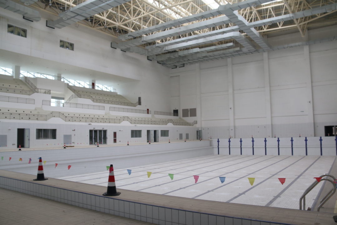 游泳馆位于一层,设有50x25米的标准游泳池、25x25米的训练游泳池、21x12米的戏水池,另有淋浴、更衣等辅助用房及735个观众席座位。