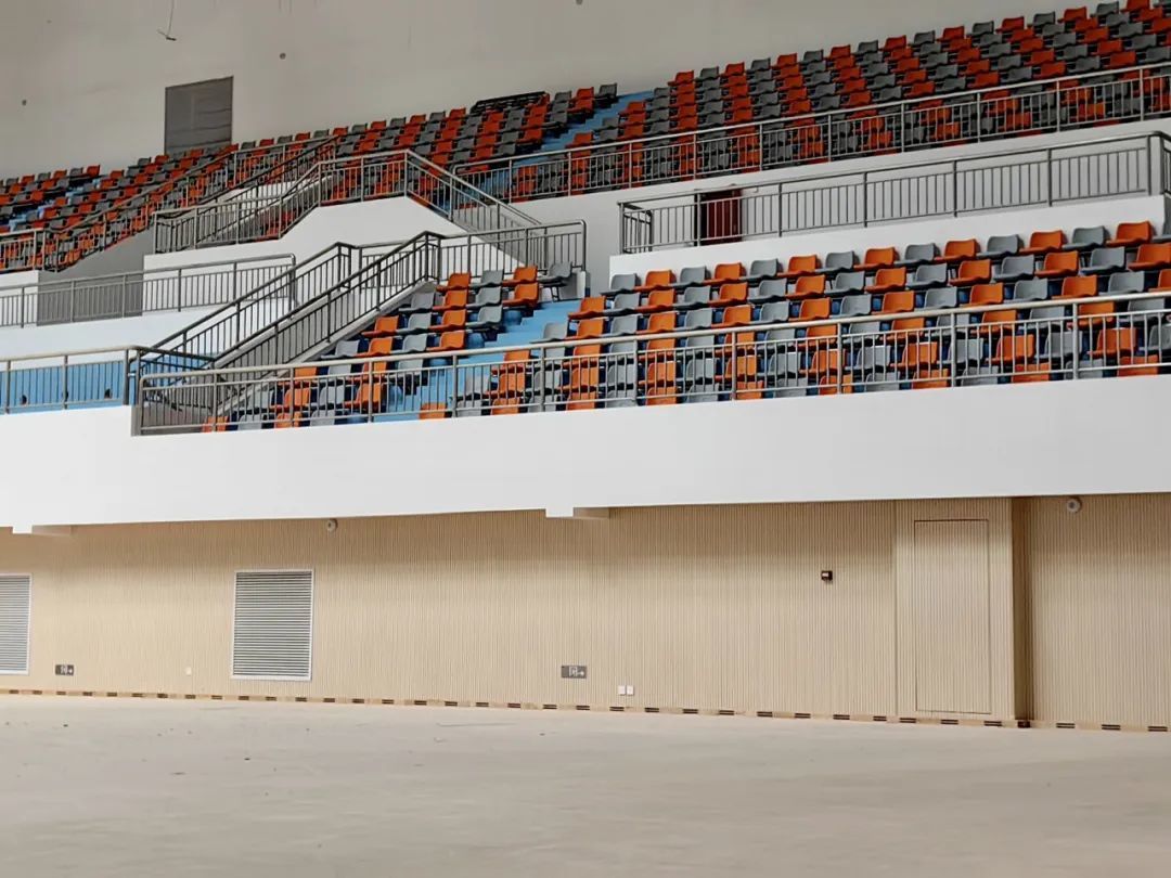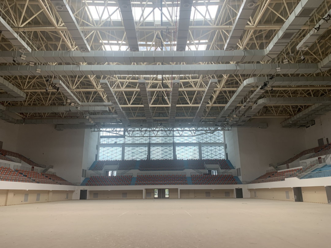 体育馆、游泳馆分别位于1号楼东西两侧。其中,体育馆对标大型体育赛事要求建设,在一层设有约2800平方米的比赛场地以及相关训练场地、运动员用房、新闻工作用房、计时计分用房等,在二、三层设有观众席座位5980个。