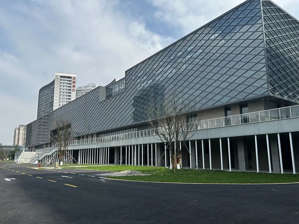 “外立面设计源于‘山水杭州,潮起下沙’的灵感,设计结合了钱塘特有文化,将连绵江水作为景观延伸,采用双表皮形式,通过玻璃上圆点的疏密变化,渲染出江水涟漪的意境。”