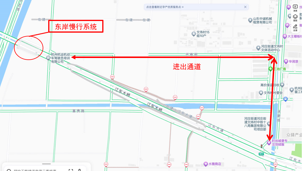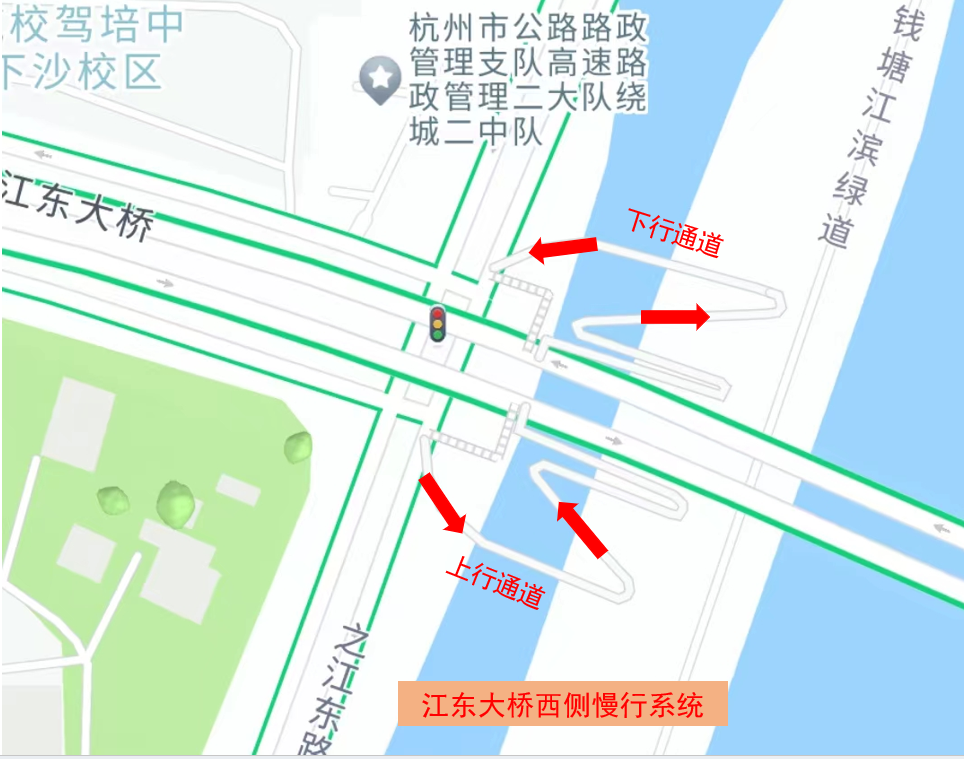 西岸慢行系统位于江东大道与之江东路交汇处(浙江财经大学下沙校区东侧);东岸慢行系统位于钱塘区河庄街道文伟村。
