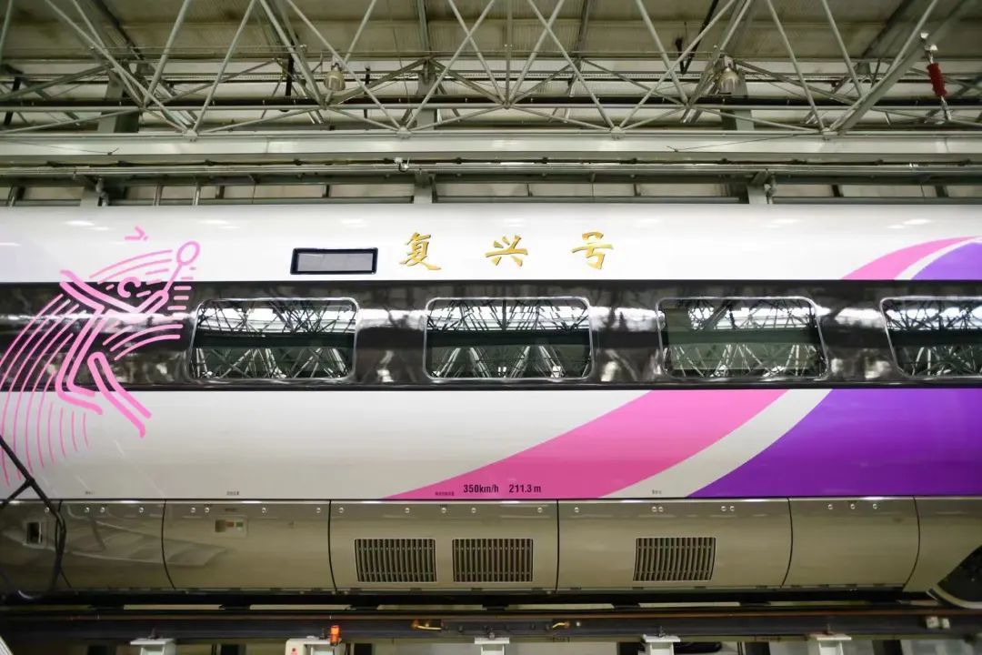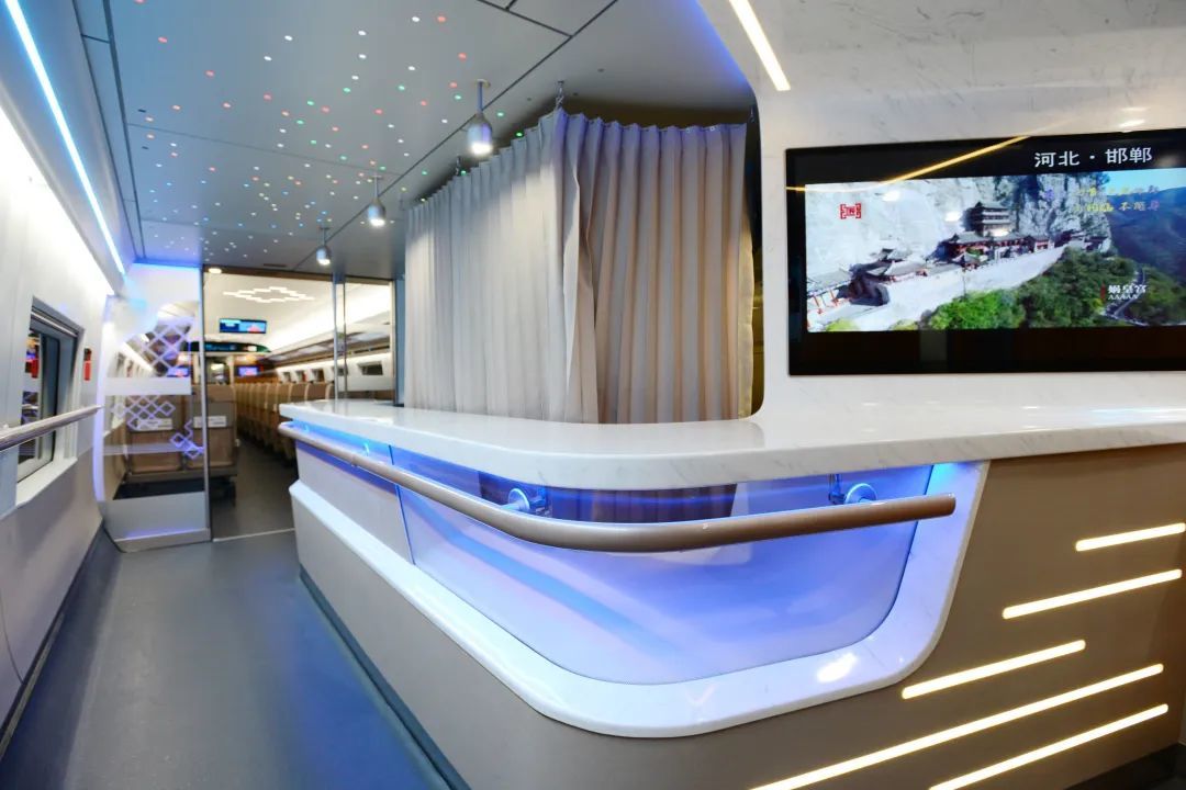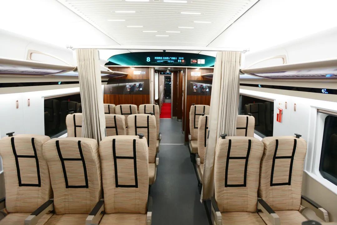 该动车组由8节车辆组成,定员578人,设计运行时速350公里,部分车厢内部功能区可实现与乘务员间的智能交互。