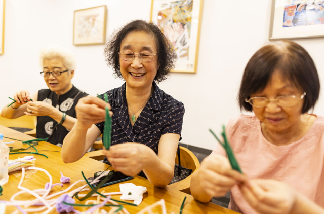 ▲老年居民参加“红巷·幸福邻里坊”编织活动。