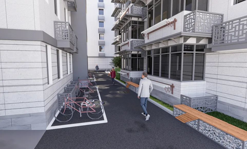 其次,要让空间“多”起来。梳理 小区内部现有空间,拆除辅房,设置集中停车区和景观休闲公园,适当扩大周边休闲空间及景观空间,并在非机动车棚上部设置爬藤植物,提升内院品质。