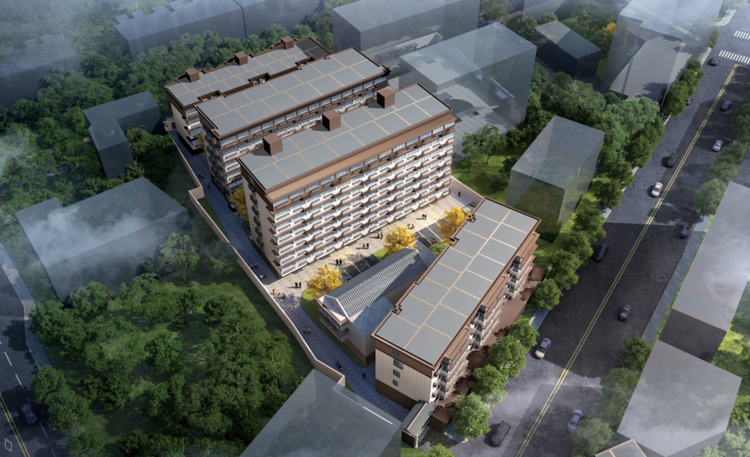 “外”改造 ——将原有空鼓外墙面铲除,重新喷涂岩彩漆,调整建筑外立面颜色;替换现有老旧建筑窗户,拆除雨棚保笼,打通逃生“生命通道”,统一设置雨棚晾衣杆及伸缩晾衣架;规整立面空调机位位置,增加空调外机格栅;拆除现有太阳能热水器,屋面修补重做防水。