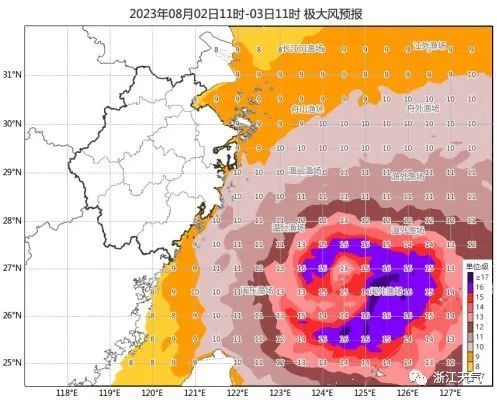 受其影响,今天中午到后天东海北部海域阵风9~11级,东海中南部海域阵风13~15级,台风中心经过的附近海域可达16-17级。浙江沿海海面今天中午到夜里最大阵风8~10级,明天后天9~11级;8月3日沿海地区也有6~8级阵风。
