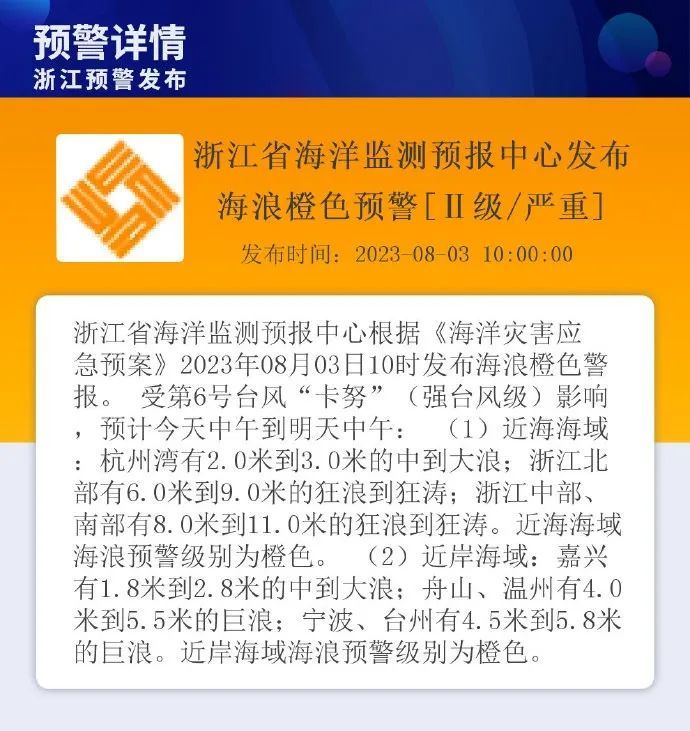 浙江省海洋监测预报中心根据《海洋灾害应急预案》,于今日10时发布风暴潮红色预警、海浪橙色预警。