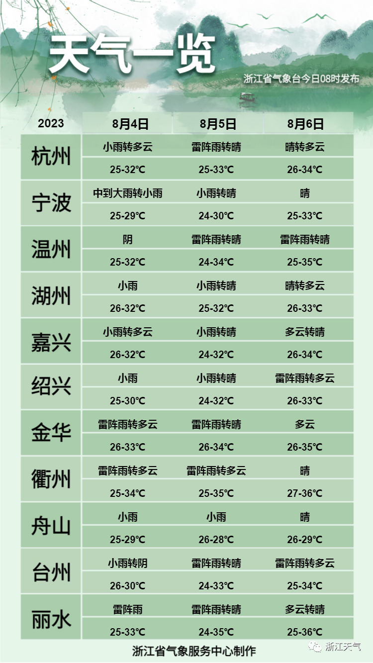 8月3日至4日:浙江沿海地区多云到阴有阵雨或雷雨,其中中北部沿海部分中到大雨,局部暴雨,个别大暴雨;其它地区多云有分散性雷阵雨。以上有雷雨地区可伴有短时暴雨。