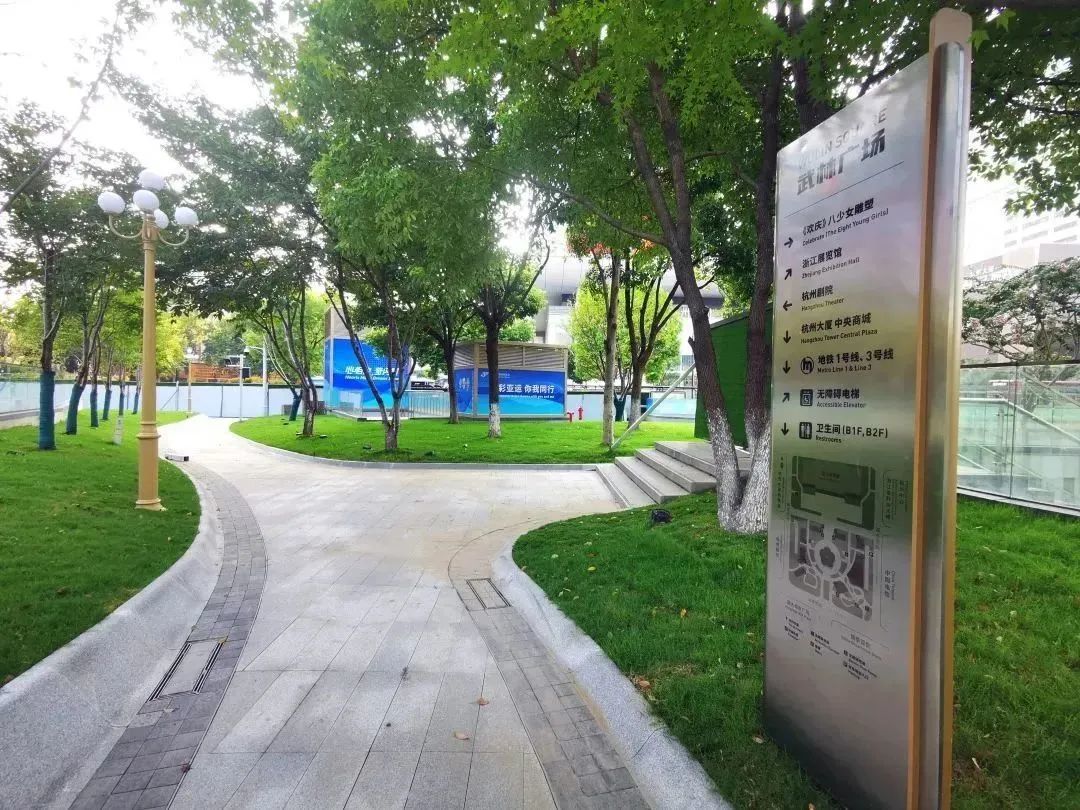 除此之外,本次改造提升还拆除了北广场东西侧绿篱以及广场周边约400米的硬隔离,取而代之的是3条东西走向的游步道。为了当好东道主做好亚运服务保障工作,武林广场还新增4个数智指路机器人,优化升级了5个地下人行通道指示牌,设置16处双语导视牌,以便让来自世界各地的朋友能在杭州享受到便捷的交通服务。