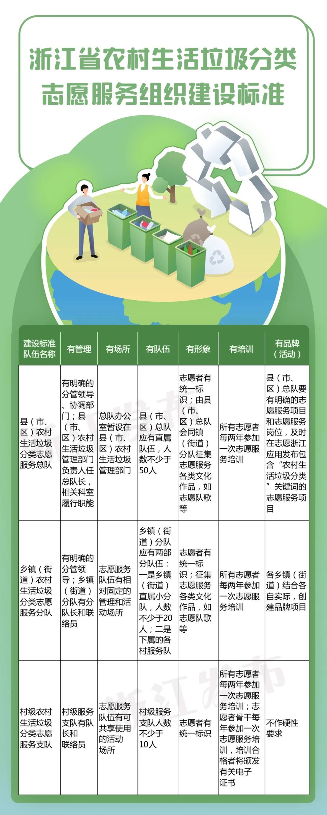 《方案》明确,浙江将健全农村生活垃圾分类志愿服务组织,按照组建标准和制度规范开展工作,创新志愿服务载体和形式,打造志愿服务品牌等。