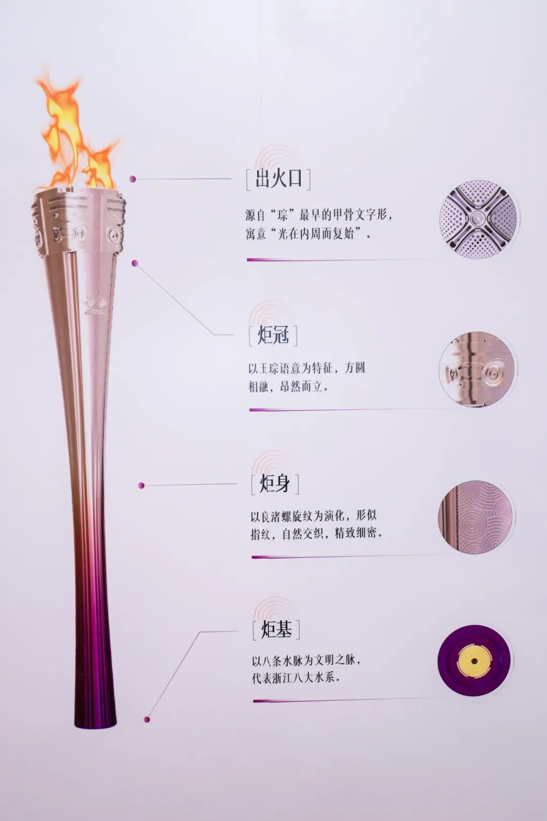 •色彩上,火炬上半部分为丹桂金,从“腰线”往下渐变为亚运主题色“虹韵紫”。