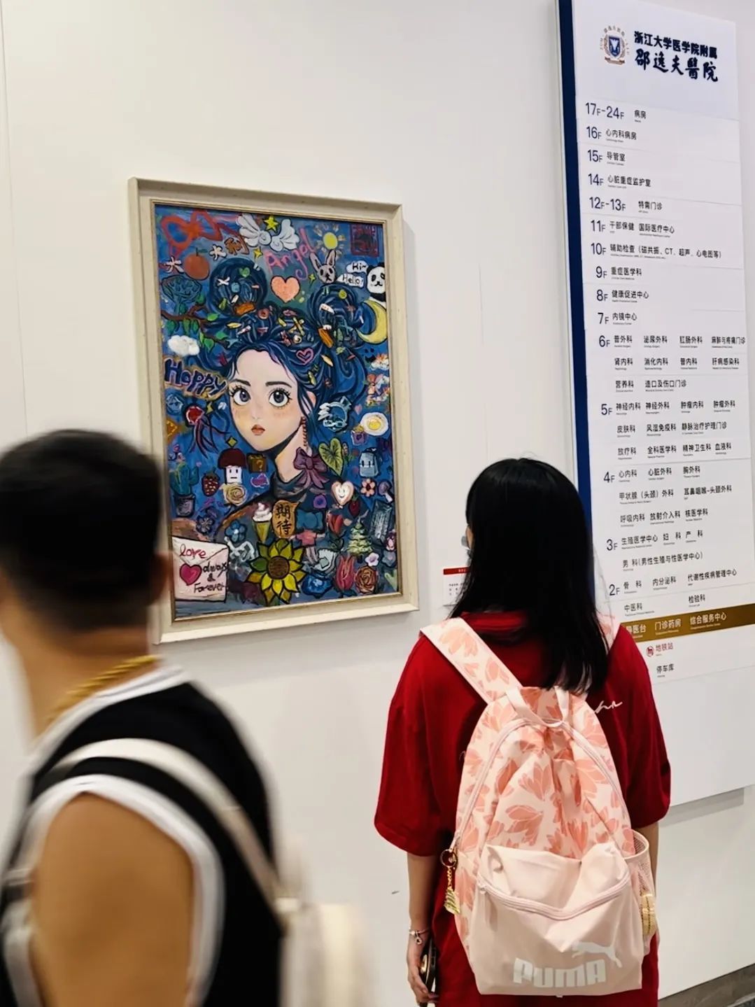 方寸心的愿望实现的背后,离不开中国美术学院与浙大邵逸夫医院的共同助力,在收到她的愿望后,“微笑大瓶”主办方中国美院的老师便行动起来,相比独立的画廊或艺术馆,大家更希望这些来自街头的共创画作,能够在杭州市民的生活场景中呈现,这个想法,与浙大邵逸夫医院一拍即合。