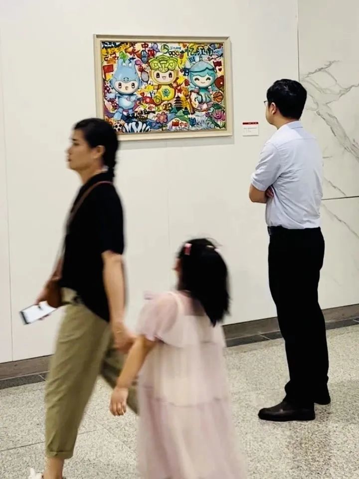 值得一提的是,其中处于c位的是一幅展现亚运吉祥物“三小只”的画作,在琮琮、宸宸、莲莲周边,围满了“艺术家们”添加的各种亚运元素、城市风景和美好祝福,在大厅内颇为亮眼。