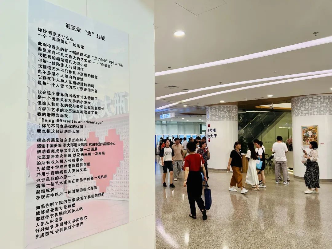 杭州亚运会开幕倒计时10天之际,独臂画家方寸心的愿望实现了——在浙大邵逸夫医院庆春院区6号楼门诊综合服务中心大厅内,12幅色彩浓烈的画作精心装裱,挂上墙面和立柱,一场意义非凡的画展正式开启!