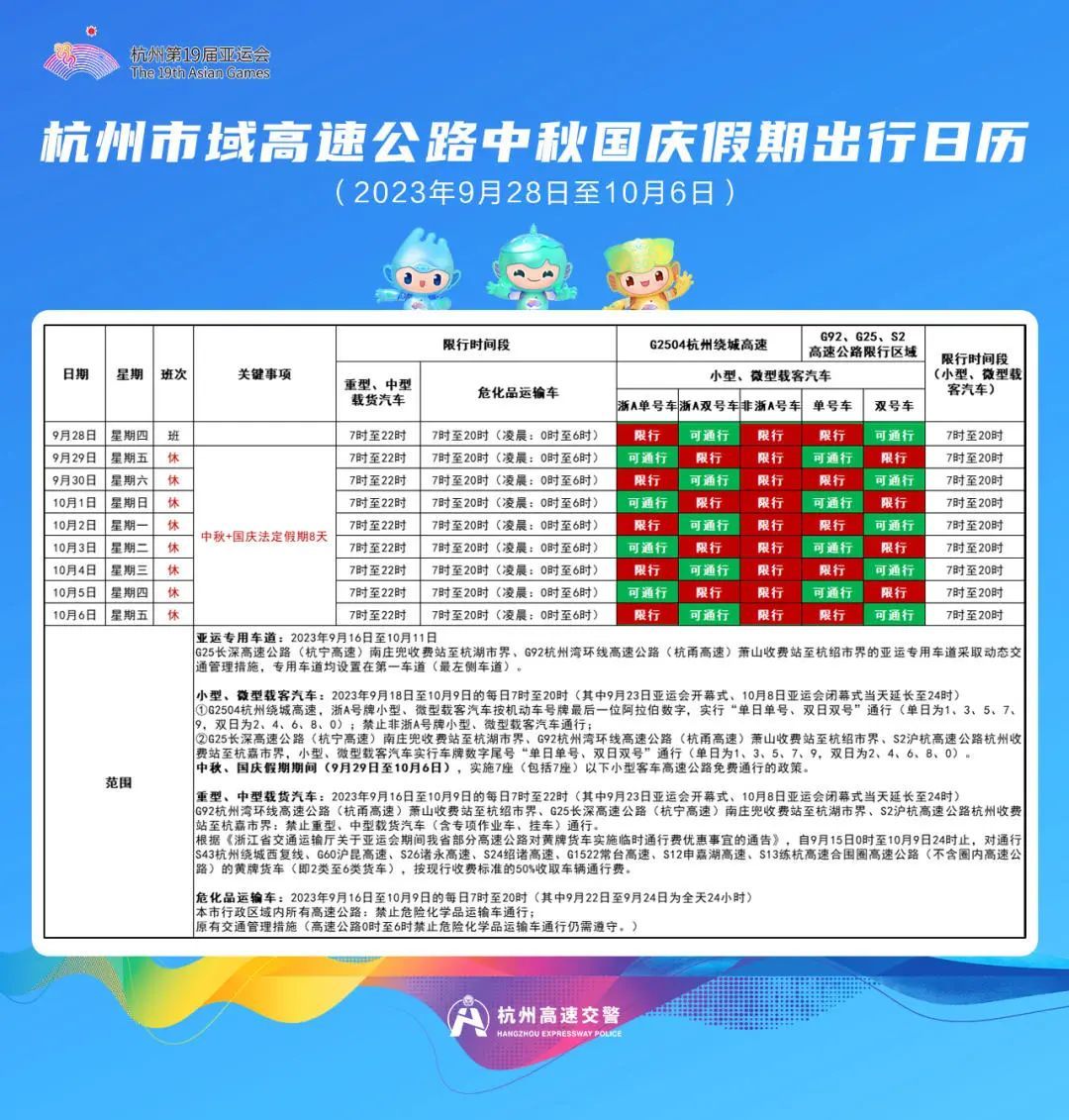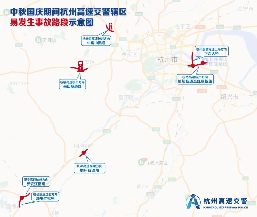 此外,“双节”期间,杭州市行政区域内主要涉及G2504杭州绕城高速、G25长深高速(杭宁高速)、G92杭州湾环线(杭甬高速)、S2沪杭高速等路段采取交通管理和服务保障措施。