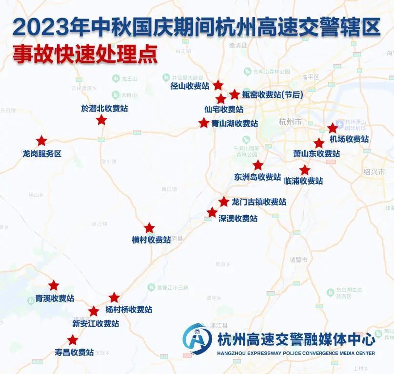 17个事故快速处理点:G56杭瑞高速青山湖收费站、龙岗服务区;G92杭州湾环线机场收费站,G60沪昆高速萧山东收费站、临浦收费站;G4012溧宁高速新安江收费站、寿昌收费站、青溪收费站;G6021杭长高速杨村桥收费站;S14杭长宜高速径山收费站(节前)、瓶窑收费站(节后);S43杭州绕城西复线仙宅收费站;G25长深高速东洲岛收费站、龙门古镇收费站、深澳收费站;S29临金高速於潜北收费站、横村收费站。