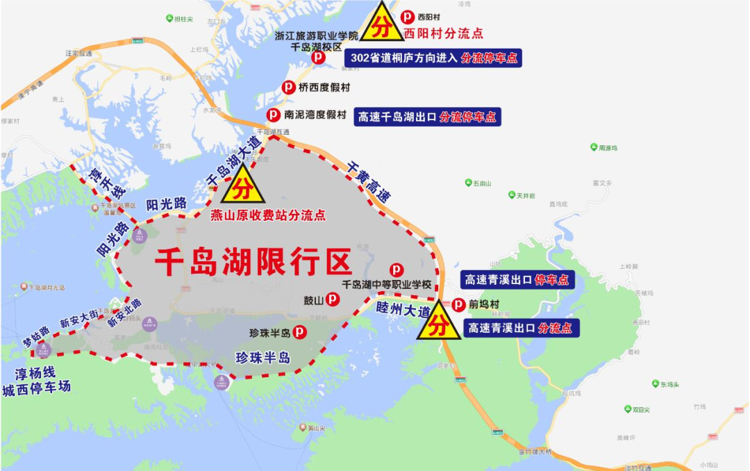 从千岛湖收费站出口进入千岛湖城区自驾游客,如车辆限行,根据现场指挥将车辆停放在南泥湾停车服务点、桥西停车服务点、浙旅学院停车服务点或西阳村停车服务点(见下图),乘坐公交接驳巴士至千岛湖汽车客运总站(汽车北站),再乘坐城区公交前往目的地。