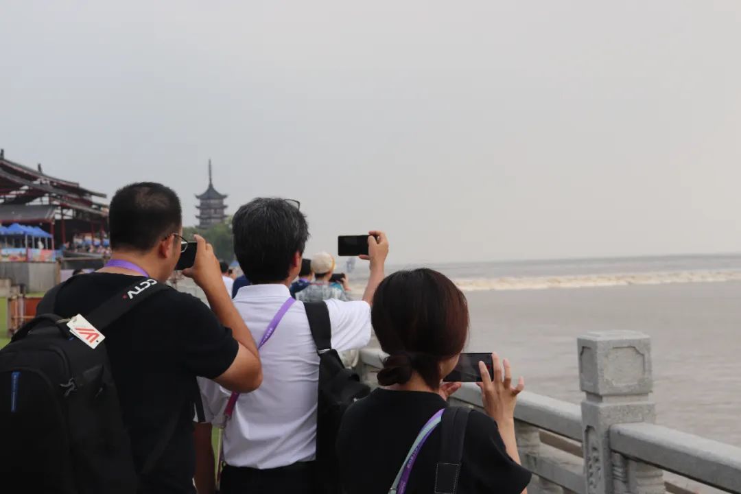中外记者们纷纷拿出手机拍下潮水壮观场面