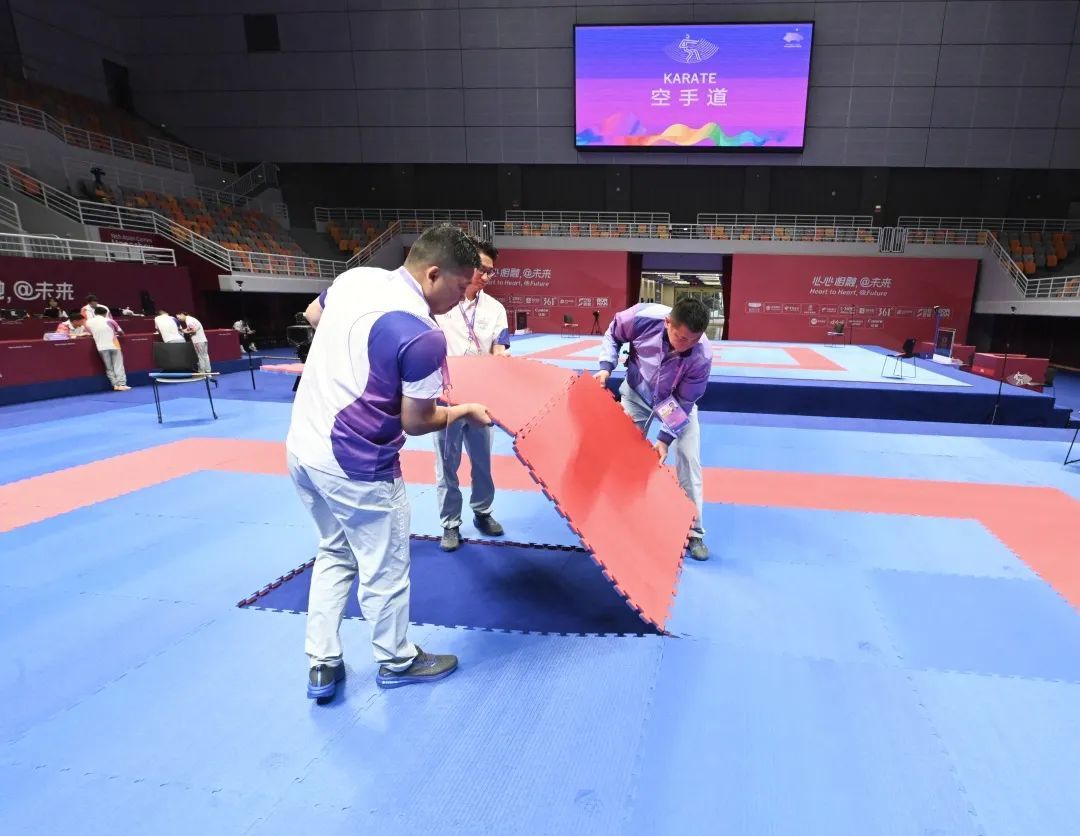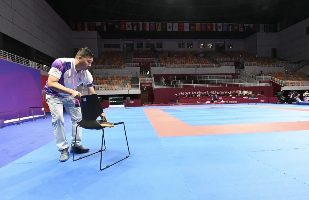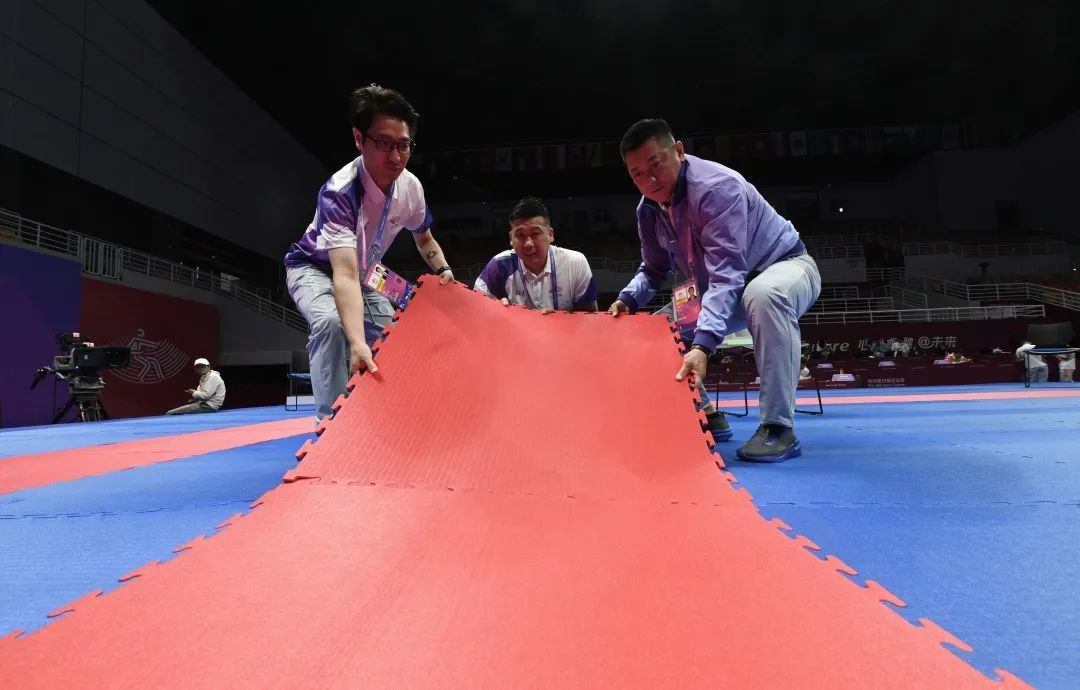 排球比赛结束后,首先要做的事情就是腾空场地,所有与排球有关的器材、背景板、物料等等都要搬离场地。“我们相当于是在一个完全空白的场地里,重新搭建符合竞赛标准的空手道场地。”徐威武说,这意味着竞赛技术运行团队必须在短时间内完成高标准的比赛场地的布置和搭建,也意味着这是一个艰巨的任务。