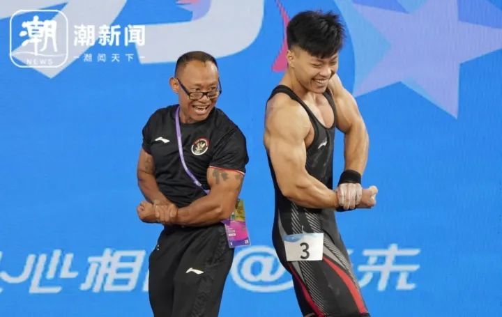 印尼运动员拉赫马特·欧文 阿卜杜拉夺冠并打破世界纪录后,与教练一起秀肌肉。潮新闻记者 杨朝波 摄