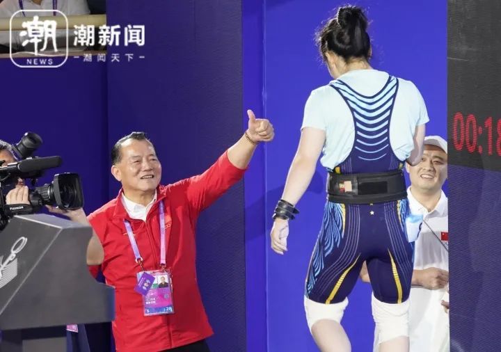 中国运动员罗诗芳第三次挺举试举失败后,教练微笑着给她点赞以示鼓励。潮新闻记者 杨朝波 摄