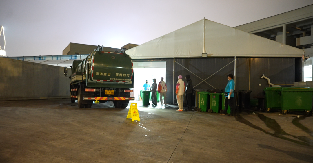 22:00,运动员餐厅垃圾清运点,亚运村环境保护专员陈卓伟正和他的同事们一起忙碌着。