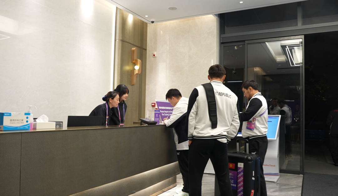 23:40,亚运村运动员村二区北居服中心门口,几名运动员正听着音乐唱着歌,不时有运动员进出楼栋,几名工作人员正在整理“小红车”,前台咨询业务量一点都不少。