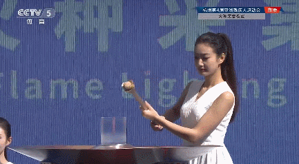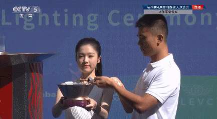9时49分,采火使者手持采火棒,缓步走到圣火台前,将采火棒伸向长燃着的亚残运会火种,成功点燃采火棒。