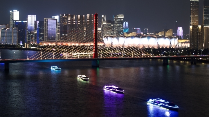 沿着钱塘江夜游游线,“钱印号”“梦航号”游船与5艘新船一起,依次编队行驶。同一时间,两岸灯光璀璨,一边是钱江新城的“日月同辉”及城市阳台灯光秀,一边是刚刚集聚世界目光的杭州奥体中心。正可谓,“你坐在船上看风景,看风景的人在岸上看你”。