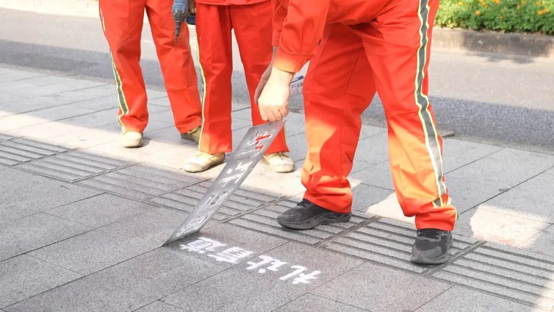 在人民广场东侧公共厕所的无障碍卫生间内,施工人员正敲打各个扶手检测其稳定性,对于一些松动的部件及时进行了加固处理。同一侧的人行盲道处,施工人员在盲道附近喷涂了多个“礼让盲道”标识,以减少盲道侵占的情况。