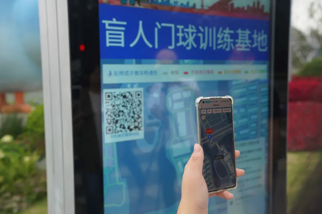 6个语音提示器、4个智能服务桩、1个综合大屏与1个明盲对照导览图,构成了盲人门球基地入口处的“无障碍服务圈”。通过蓝牙发射器或智能APP触发,语音提示器便会为视障人士播报当前位置与前进方向。综合大屏与服务桩,则可以通过智能交互,为残障人士提供无障碍的路线规划与出行指引。